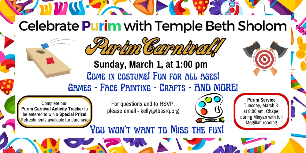 Celebrate Purim with Temple Beth Sholom with our 2026 Purim Carnival!