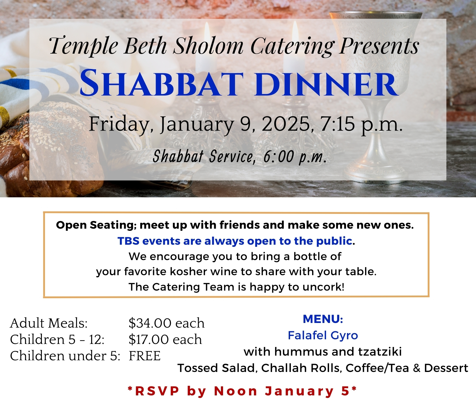 Kosher Shabbat Dinner catered by TBS's Catering Team . (Click here to view the flyer with full menu)