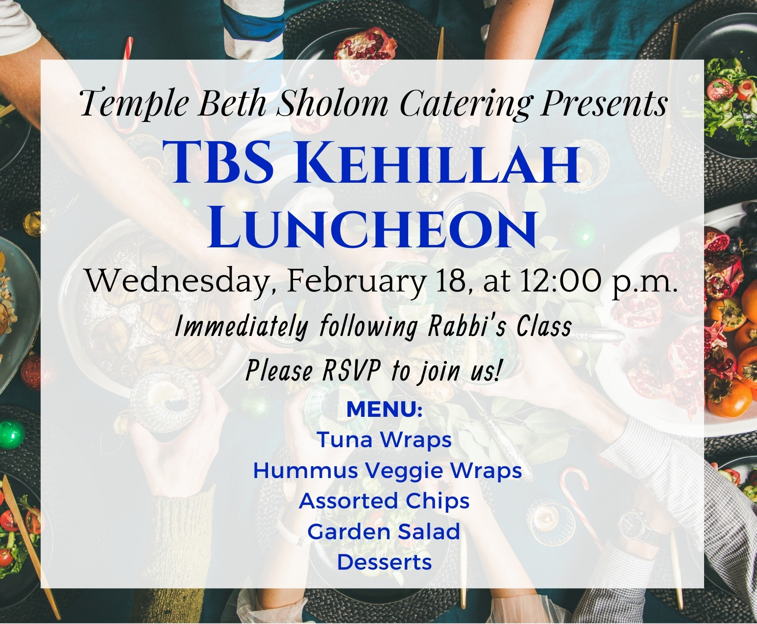 Kosher luncheon catered by the TBS Catering team . (Click here to view the flyer with full menu)